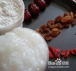 1. 材料准备:糯米粉、白糖、温水、酵母、红枣、葡萄干等。